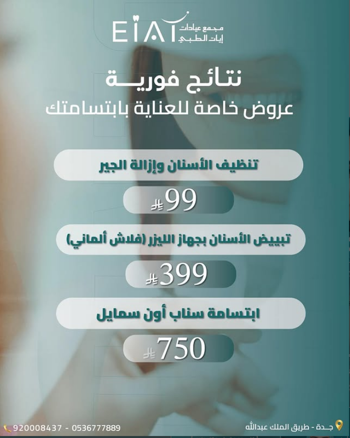 في مجمع عيادات إيات، نلتزم بتقديم أفضل رعاية طبية في الأسنان، الجلدية، والليزر.